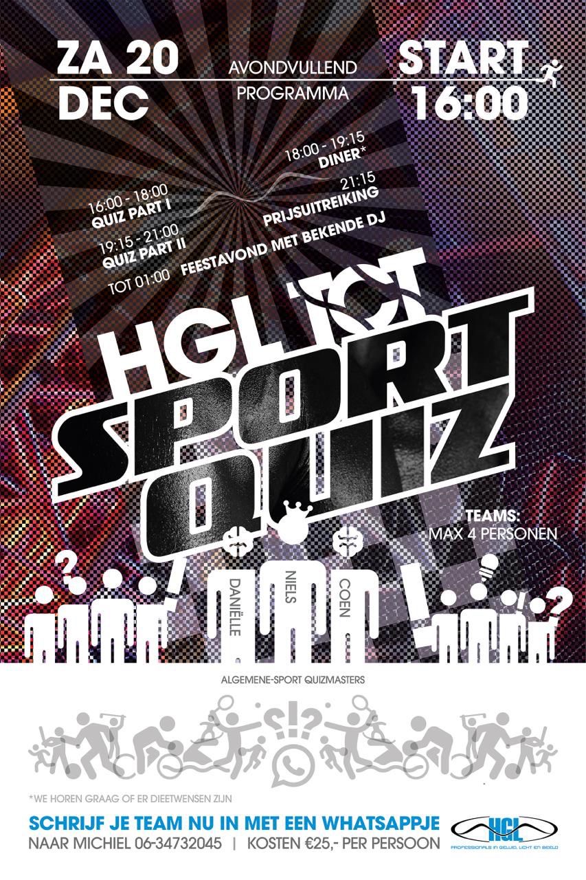 Zaterdag 20 december staat de 2e editie van de HGL TCT sportquiz op het programma. Vanaf 16.00 trappen we af met een avondvullend programma vol sportieve kennis, gezelligheid en competitie. De quiz wordt geleid door de altijd enthousiaste Niels, zijn strenge maar rechtvaardige assistente Danielle en voor de techniek staat Coen paraat.